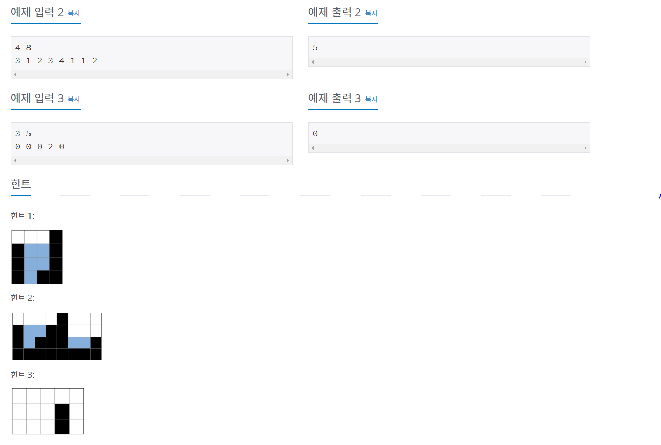 첫 번째 줄에는 2차원 세계의 세로 길이 H과 2차원 세계의 가로 길이 W가 주어진다. (1 ≤ H, W ≤ 500) 두 번째 줄에는 블록이 쌓인 높이를 의미하는 0이상 H이하의 정수가 2차원 세계의 맨 왼쪽 위치