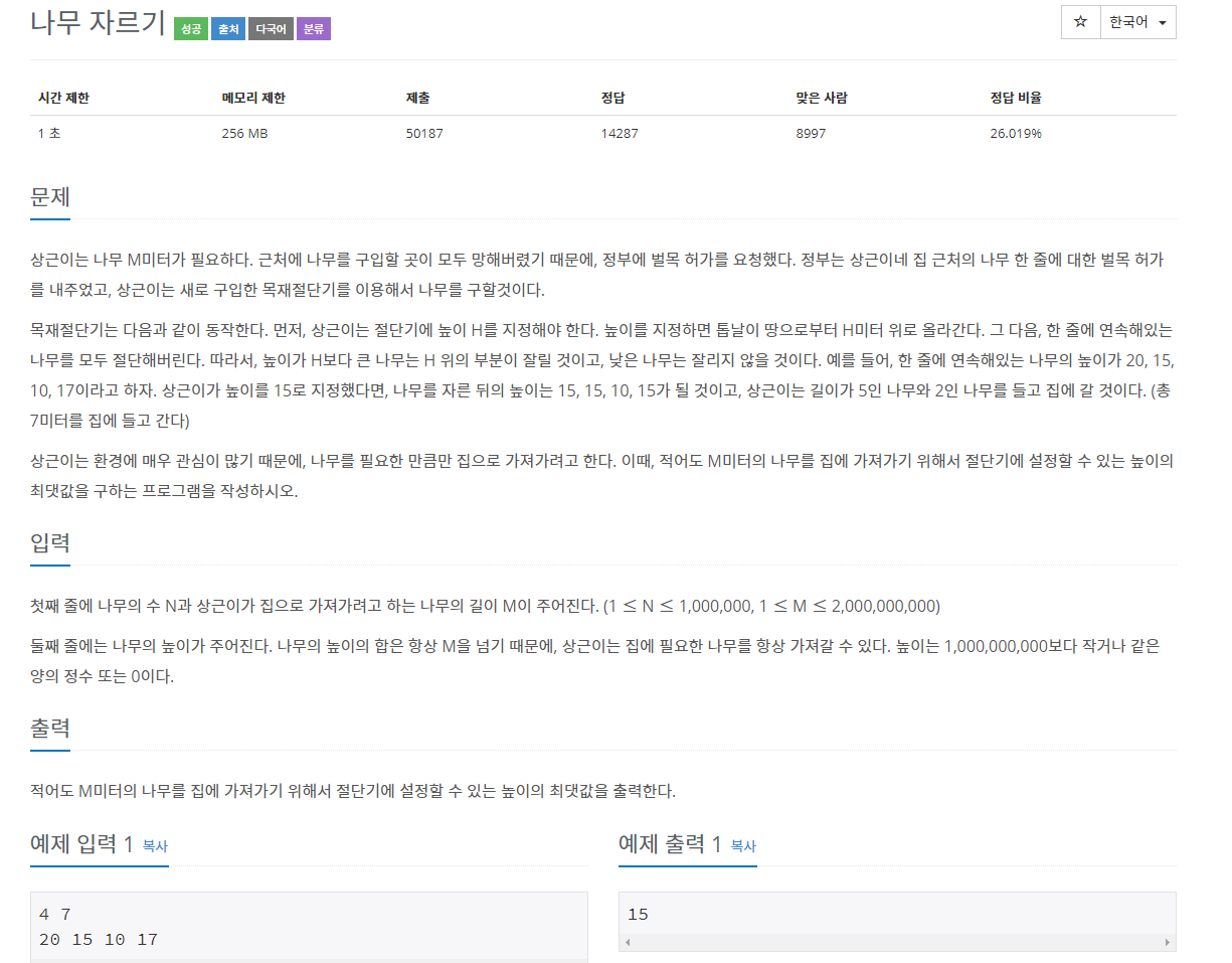 [알고리즘] 백준 2805 나무자르기 -이분탐색- 자바 코틀린 본문