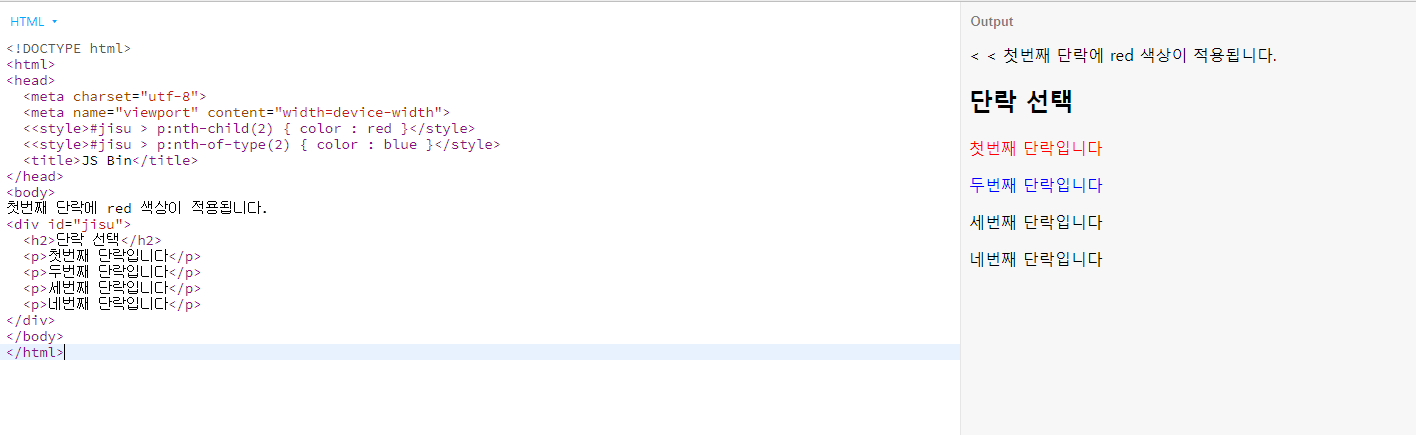 #jisu > p:nth-of-type(2)는 jisu라는 id를 가진 태그 자식들 중에 두번째로 나오는 p태그에 CSS적용을 하는 것이다. nth-child와 차이점으로 자식이 p, span , p여도 세번째 나오는 p가 두번째로 나오는 p태그이므로 css 적용이 된다.