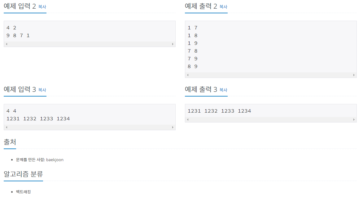 N개의 자연수와 자연수 M이 주어졌을 때, 아래 조건을 만족하는 길이가 M인 수열을 모두 구하는 프로그램을 작성하시오. N개의 자연수는 모두 다른 수이다. N개의 자연수 중에서 M개를 고른 수열