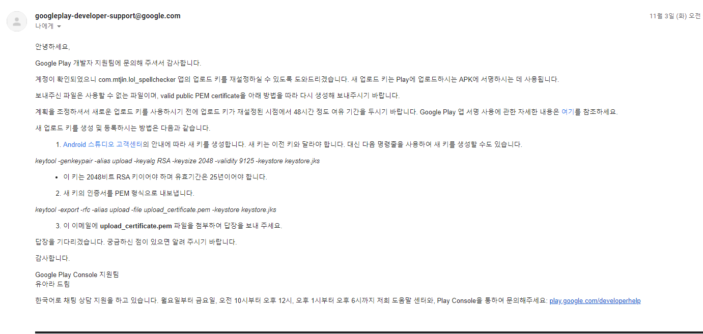구글에서 보낸 명령어가 위에서 제가 사용한 명령어와 다르길래 잘못했나 싶어 구글에서 하라는 명령어도래 PEM 키를 만들어서 답장을 드렸습니다.
