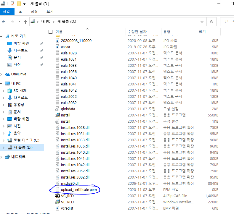 나같은 경우 밑을 보면 pem은 경로를 따로 설정하지 않아서 D:\ 에 저장되어있었다.