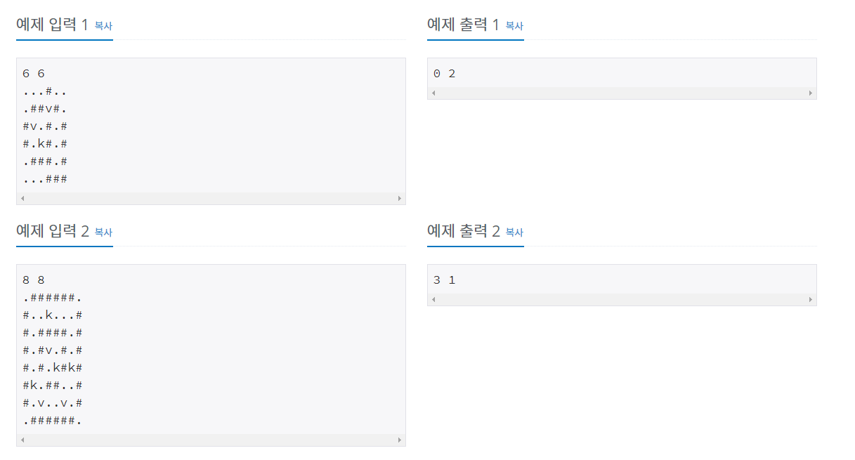 BFS를 돌며 한 영역에서 양과 늑대의 수를 비교해주고 결과를 도출해주면 됩니다.
