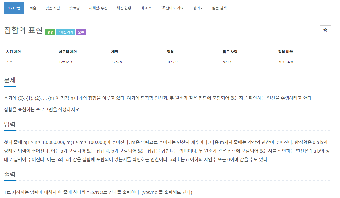 첫째 줄에 n(1≤n≤1,000,000), m(1≤m≤100,000)이 주어진다. m은 입력으로 주어지는 연산의 개수이다. 다음 m개의 줄에는 각각의 연산이 주어진다. 합집합은 0 a b의 형태로 입력이 주어진다. 이는 a가