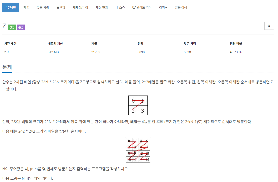 한수는 2차원 배열 (항상 2^N * 2^N 크기이다)을 Z모양으로 탐색하려고 한다. 예를 들어, 2*2배열을 왼쪽 위칸, 오른쪽 위칸, 왼쪽 아래칸, 오른쪽 아래칸 순서대로 방문하면 Z모양이다. 만약, 2차원