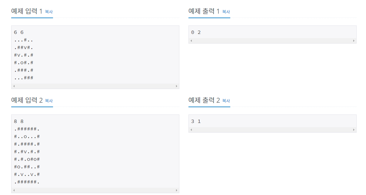 www.acmicpc.net/problem/3187 3187번: 양치기 꿍 입력의 첫 번째 줄에는 각각 영역의 세로와 가로의 길이를 나타내는 두 개의 정수 R, C (3 ≤ R, C ≤ 250)가 주어진다. 다음 각 R줄에는 C개의 문자가 주어지.
