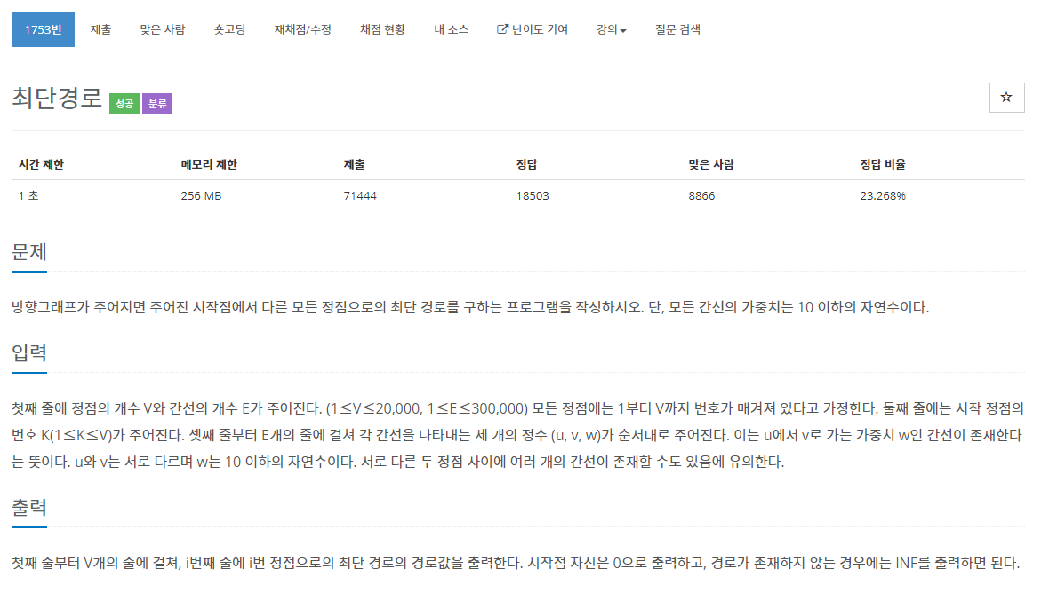 백준 최단경로 단계별풀기의 첫번째 문제입니다.