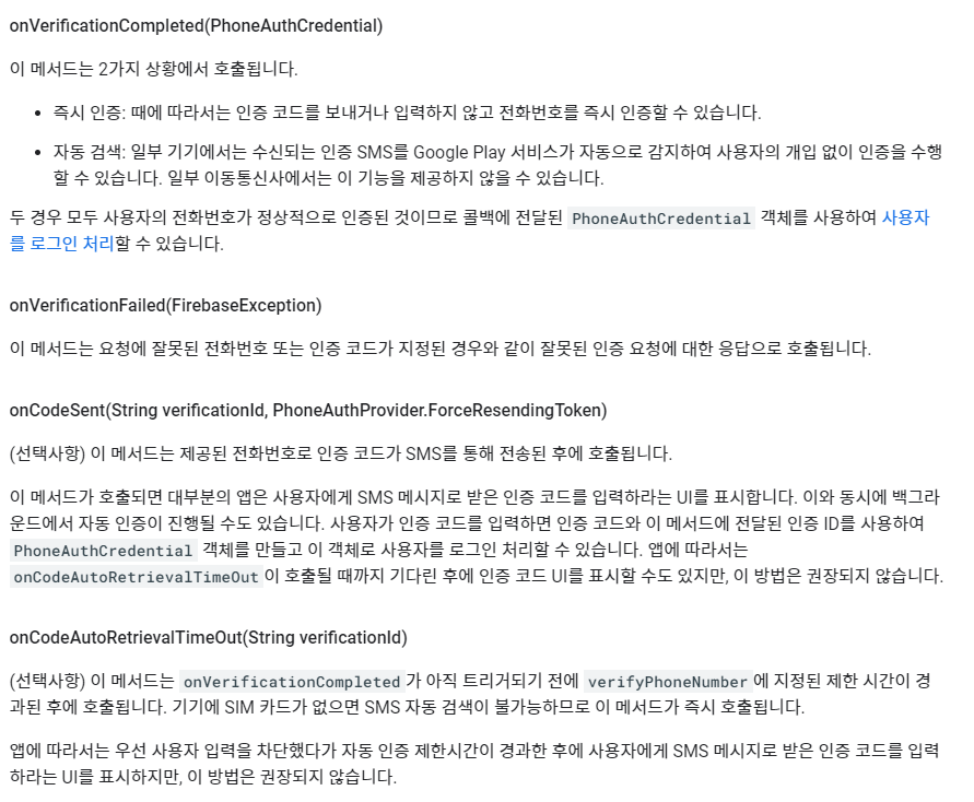 1. callbacks 가 전화번호 인증을 수신하는 객체입니다. 저 같은 경우 이 화면에 오기전에 이미 파이어베이스 이메일 로그인이 된 상태이므로 onCodeSent()로 로그인 하는 추가 로직 없이 onVertificationCompleted() 를 통해 바로 SMS 인증번호를 받을 수 있었습니다.