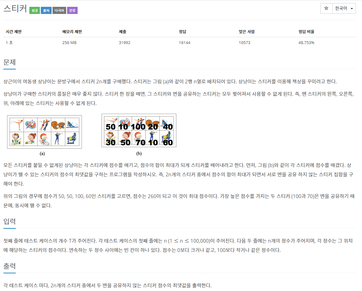 -내 생각 이 문제 역시 내 힘으로 풀 수는 없었다.. 처음 생각했던 것은 각 스티커를 붙였을 때와 붙이지 않았을 때를 고려해 각각의 경우의 수에 따라 최댓값을 찾으려 했었는데, 해결하지 못해