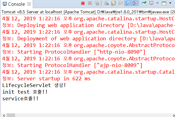 만약 다시실행키면 다음과같이 service메소드만 호출됨을 볼 수 있다. (두번 다시실행시킨 결과이다.)