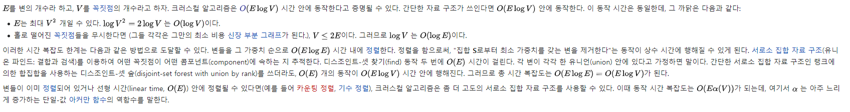 노드개수를 V, 변의 개수를 E라고 하면 O(ElogV)의 시간복잡도를 가집니다.