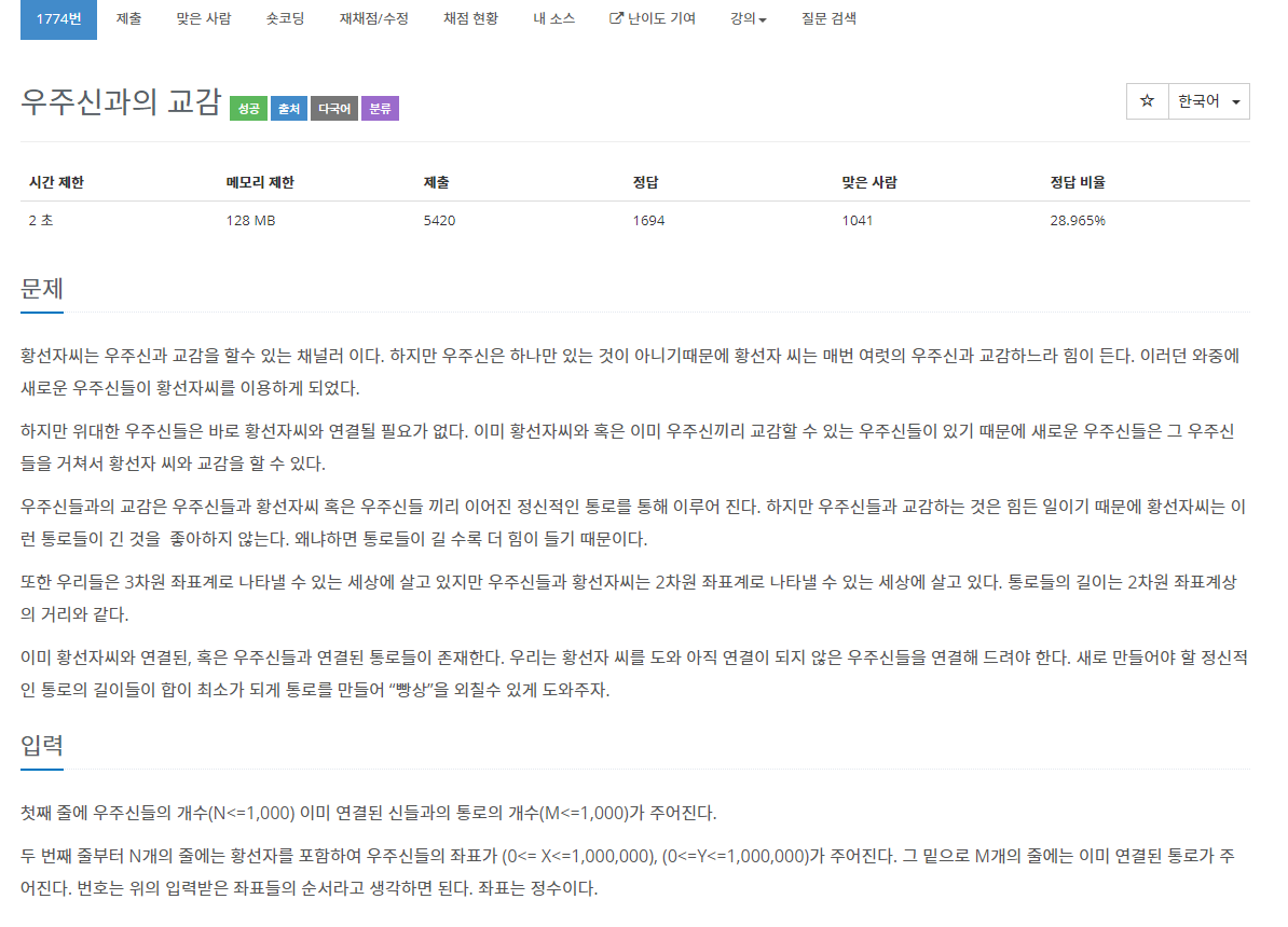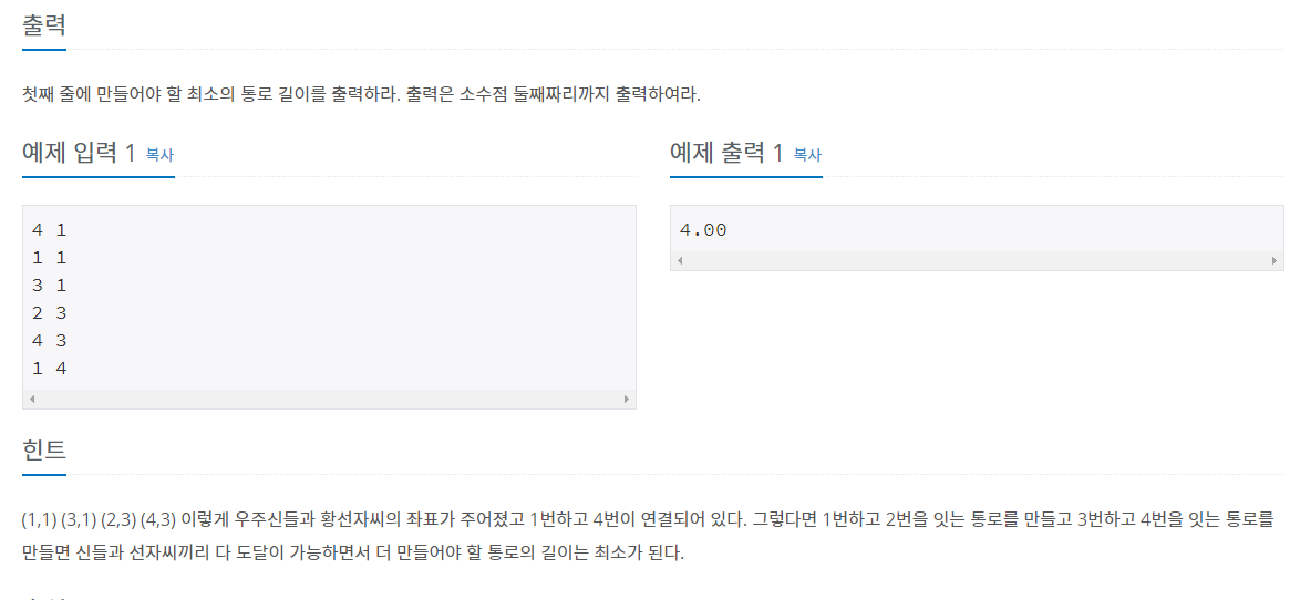 이 이후에 최소비용으로 모두 연결해서 가장 낮은 비용으로 나와 우주신들이 모두 건너건너 최소신장트리로 연결되게 하면 끝입니다.