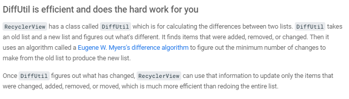 요약하면 안드로이드 어댑터에서 현재 데이터 리스트와 교체될 데이터 리스트를 비교하여 무엇이 다른지(바꼈는지) 알아내는 클래스로 리사이클러뷰에서 기존 아이템리스트에 수정 혹은 변경이 있을 시 전체를 갈아치우는게 아니라 변경되야하는 데이터만 빠르게 바꿔주는 역할을 합니다.