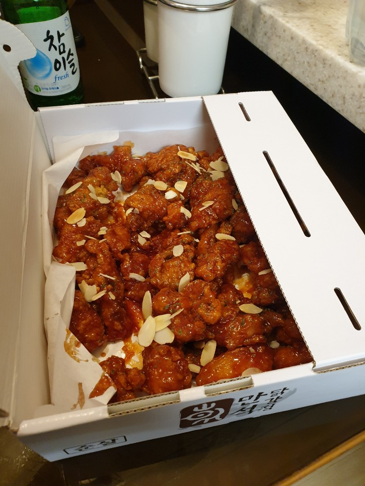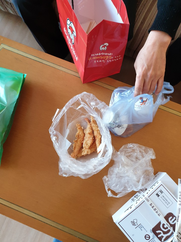 이렇게 숙소에서 쉬다가 저녁으로 시장에서 사온 닭강정과 대포항에서 사온 회를 맛있게 먹었습니다. ㅎㅎ