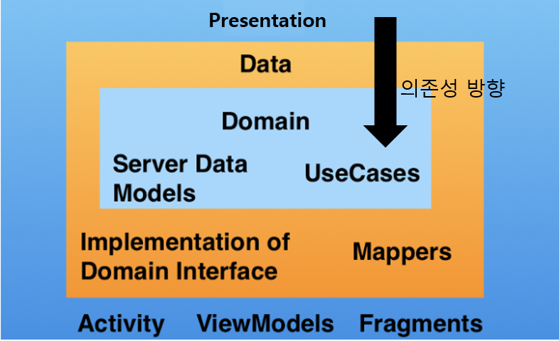 그래서 다음과 같이 안드로이드에 맞춘 이해하기 쉽게 그린 클린아키텍처 구조 그림들이 있습니다.