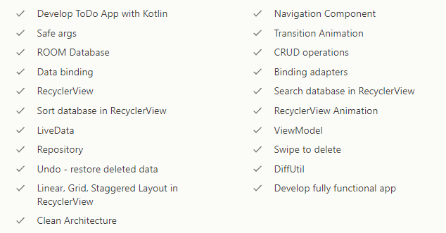 So this course will be a little different from my previous ones, because in this course we are going to build a fully functional To-Do application. We are going to build our app using Kotlin programming language, and you'll see all the benefits and power of concise way of programming with Kotlin. Our To-Do app will combine different android architecture components like Navigation Component, ROOM database, LiveData, ViewModel, Data Binding and more...