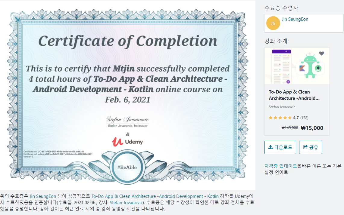 [안드로이드] Udemy 강의 수료 (To-Do App & Clean Architecture -Android Development - Kotlin)