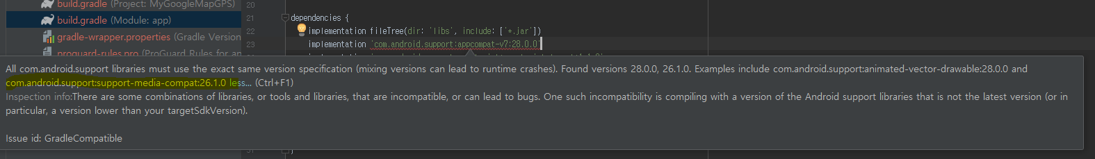 [안드로이드] [build.gradle 에러] All com.android.support libraries must use the exact same version specification (mixing versions can lead to runtime crashes). 본문