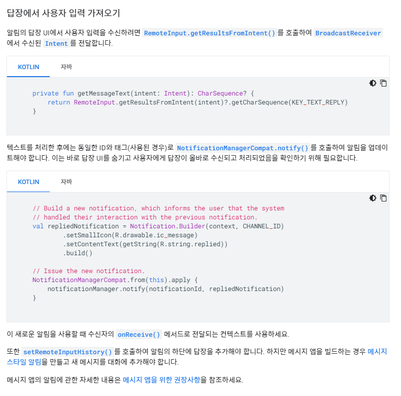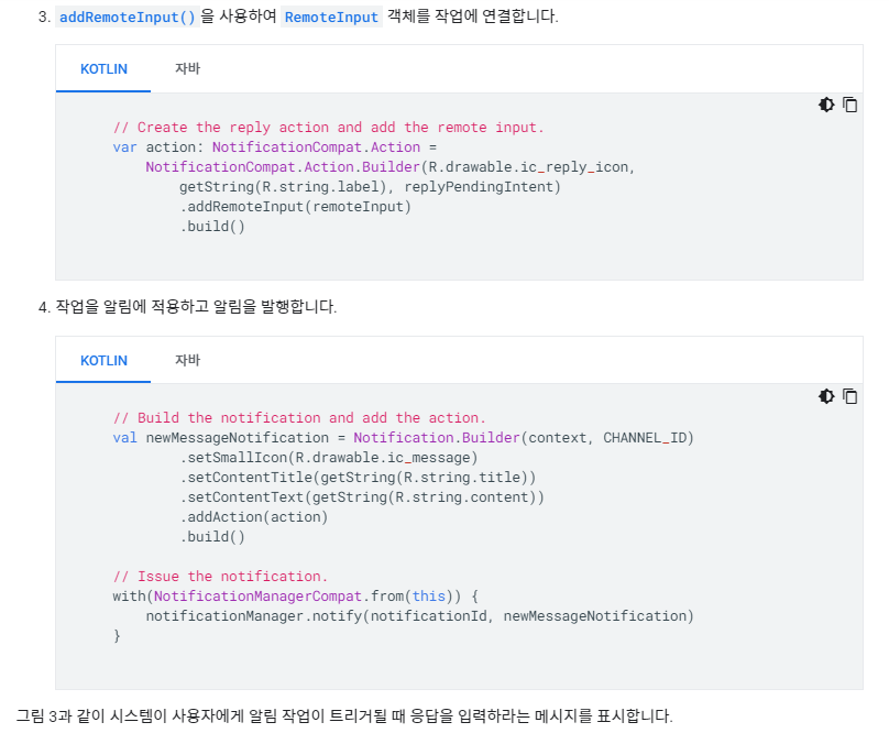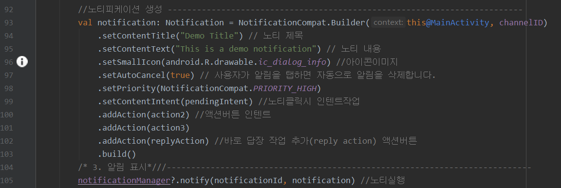 .addAction(replyAction) //바로 답장 작업 추가(reply action) 액션버튼