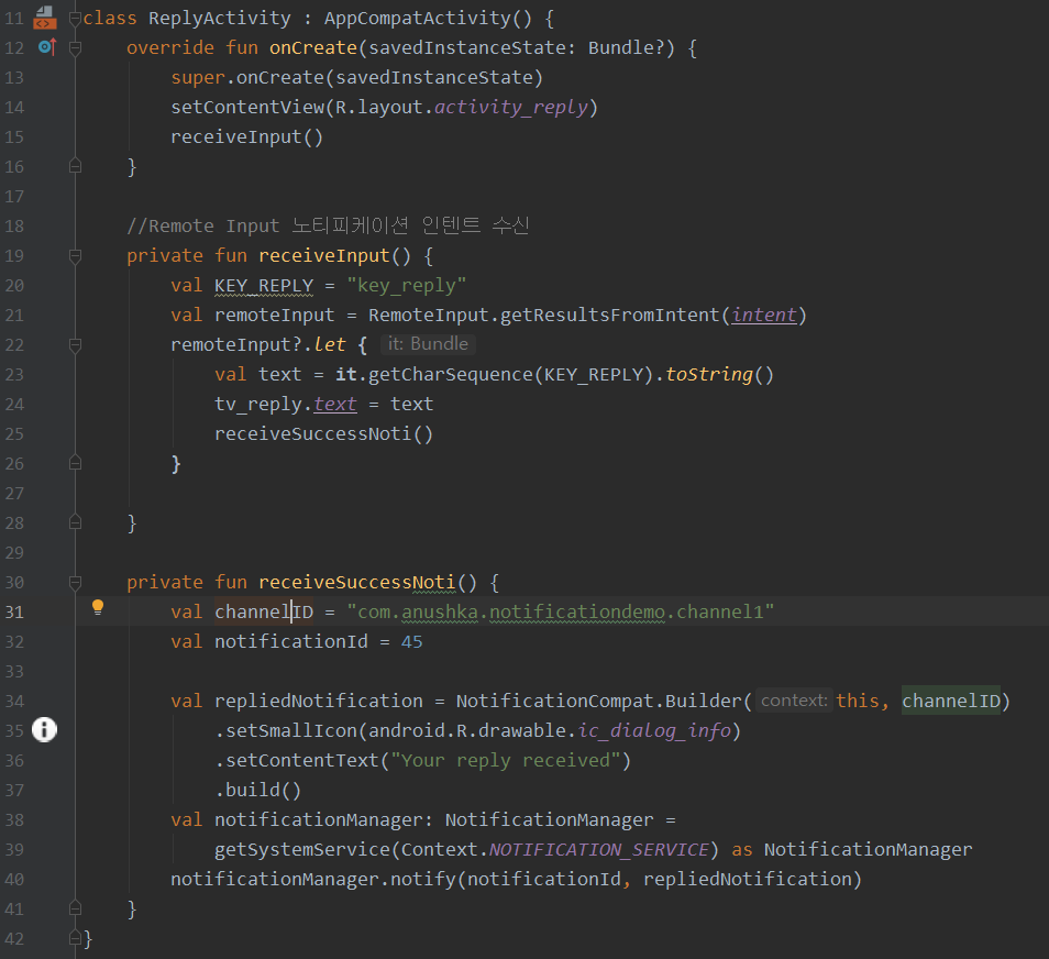 위와 같이 Reply 노티피케이션을 띄운 후 사용자가 Reply를 하게 되었을때 이동하게될 액티비티며 Reply한 내용을 받고 텍스트뷰에 세팅하고 받았다고 일반 노티피케이션을 띄워주는 예제입니다.