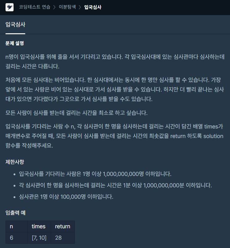프로그래머스 LV3 이분탐색 유형인 입국심사라는 문제를 풀어봤습니다.
