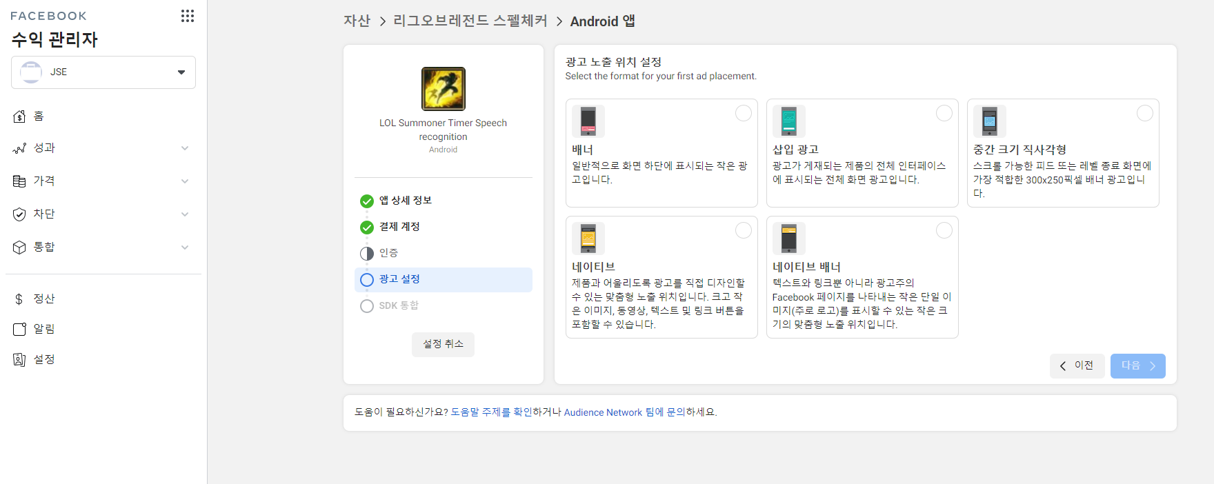 광고 설정 단계입니다. 여러가지 광고가 있네요.