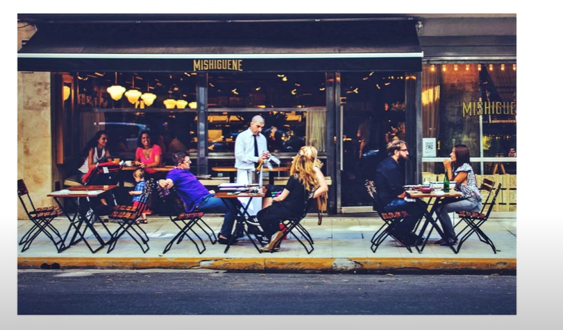 3. 레스토랑 앞 오른쪽 테이블에 두명의 사람이 얘기를 나누고 있다.