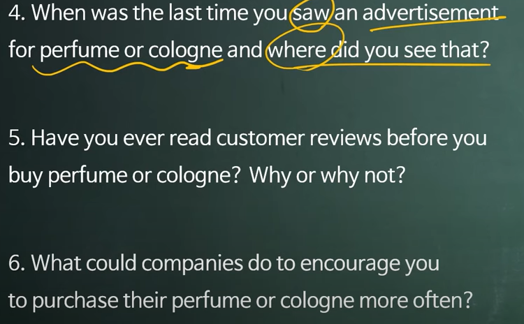 첫번째 : I saw an advertisement for perfume last weerk and I saw that at deparement store.