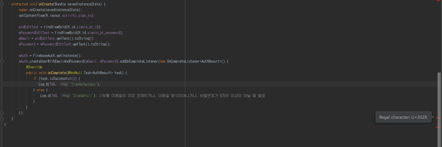 이와 같이 코드에는 빨간줄이 없는데 illegal character u2028 에러가 발생해서 실행이 안되는 것을 볼 수 있다.