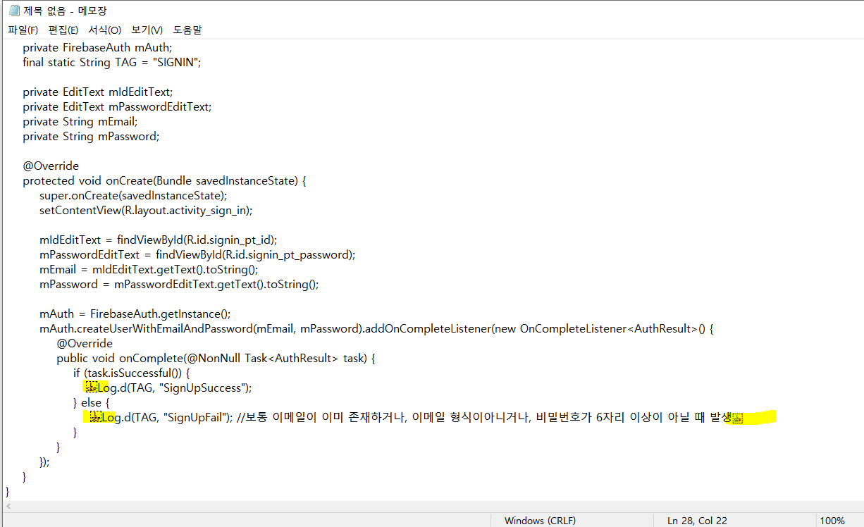 안드로이드 스튜디오에는 없던 문자가 메모장에는 있는것을 확인할 수 있다.