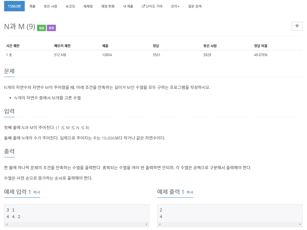 백트랙킹 시리즈문제 중 하나인 백준 15663 N과 M (9)를 풀었습니다.