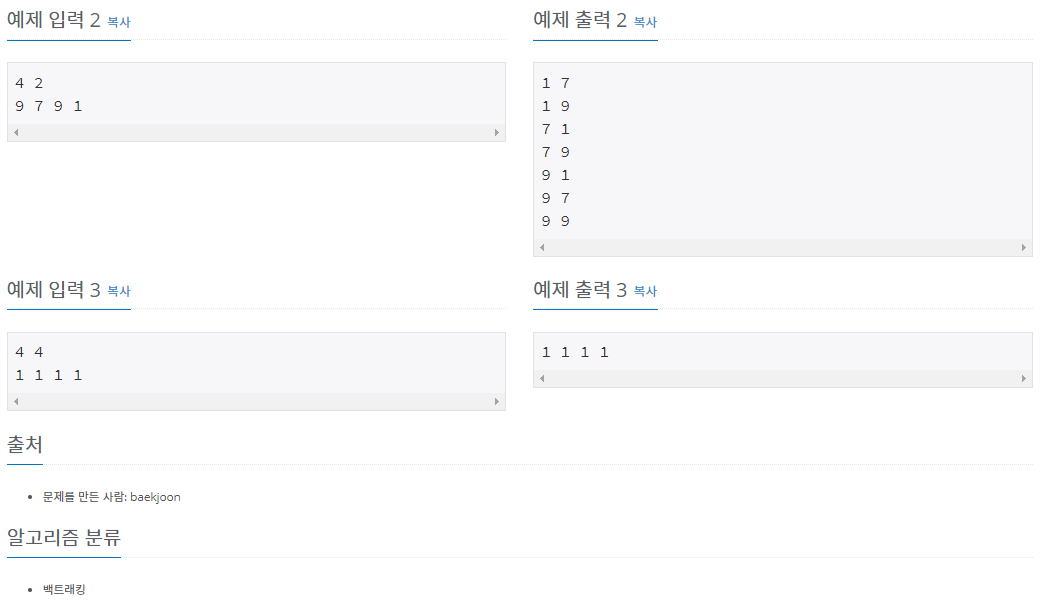 한 줄에 하나씩 문제의 조건을 만족하는 수열을 출력한다. 중복되는 수열을 여러 번 출력하면 안되며, 각 수열은 공백으로 구분해서 출력해야 한다. 수열은 사전 순으로 증가하는 순서로 출력해
