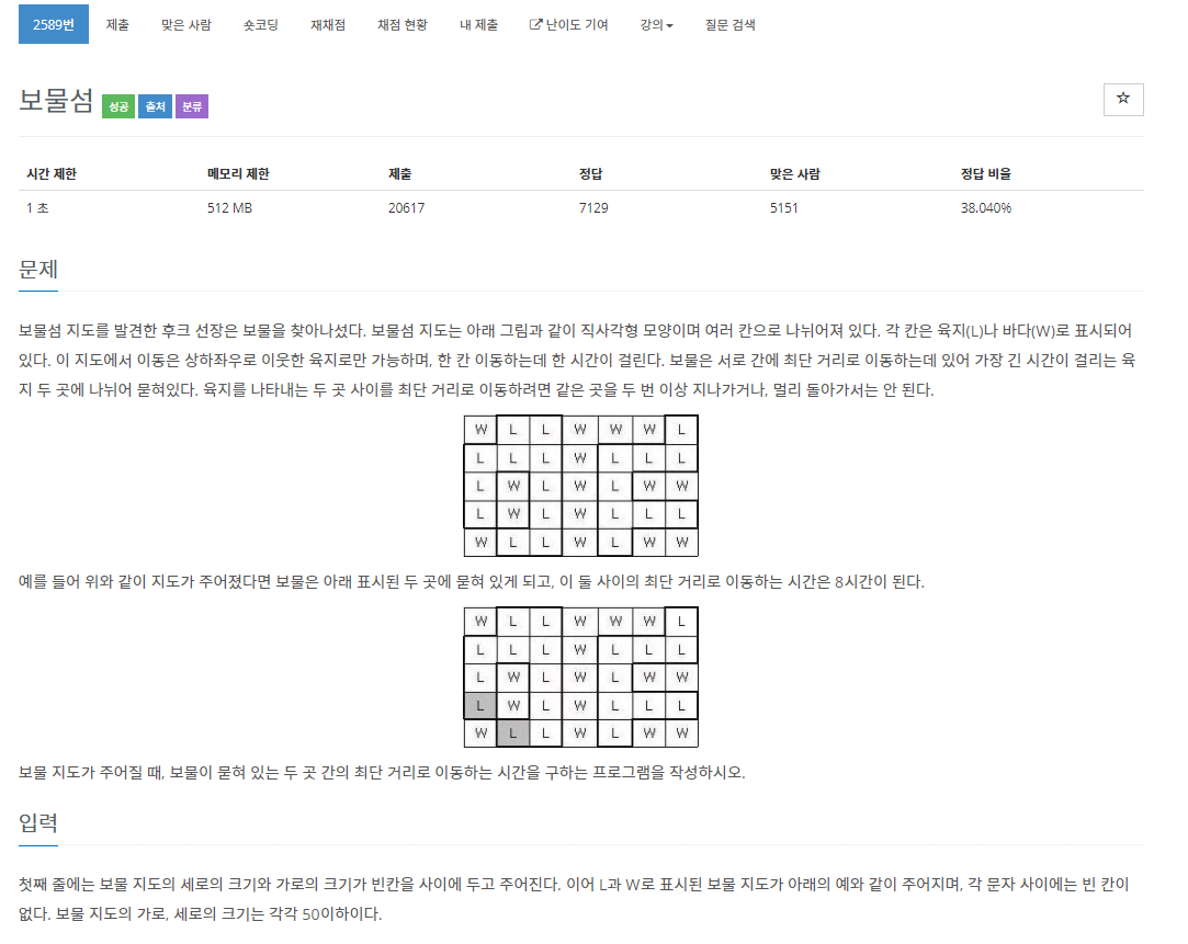 백준 2589 보물섬 문제를 풀어봤습니다. ㅎㅎ