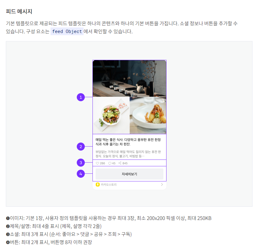 다양한 메시지 보내기 종류 중 저는 기본 제공되는 피드를 사용했고 추가적인 커스텀한 기능이 필요 없어서 기본 템플릿으로 메시지 보내기를 선택하였습니다.