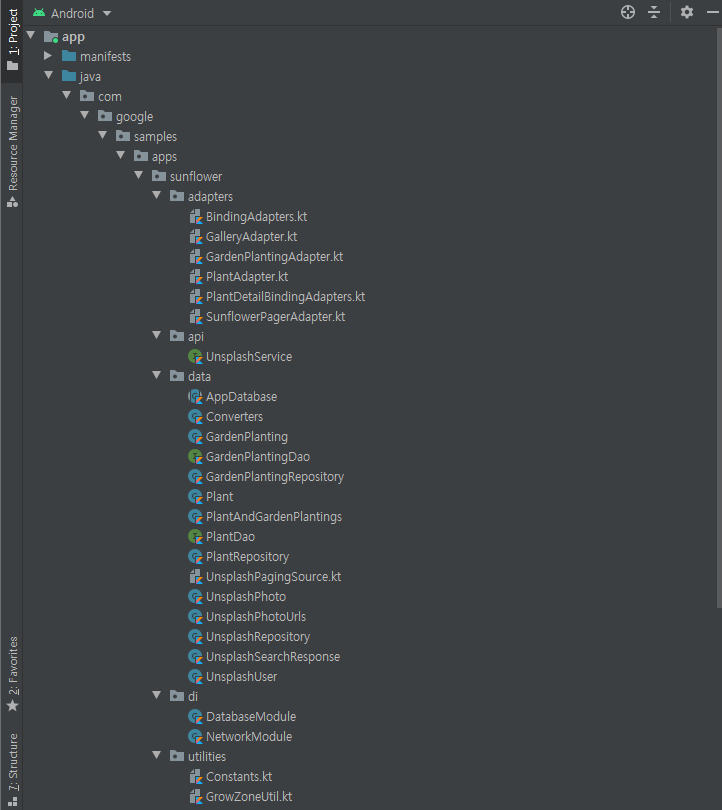 [안드로이드] 구글 공식 프로젝트 Sunflower 스터디 (2) 패키지 구조 본문