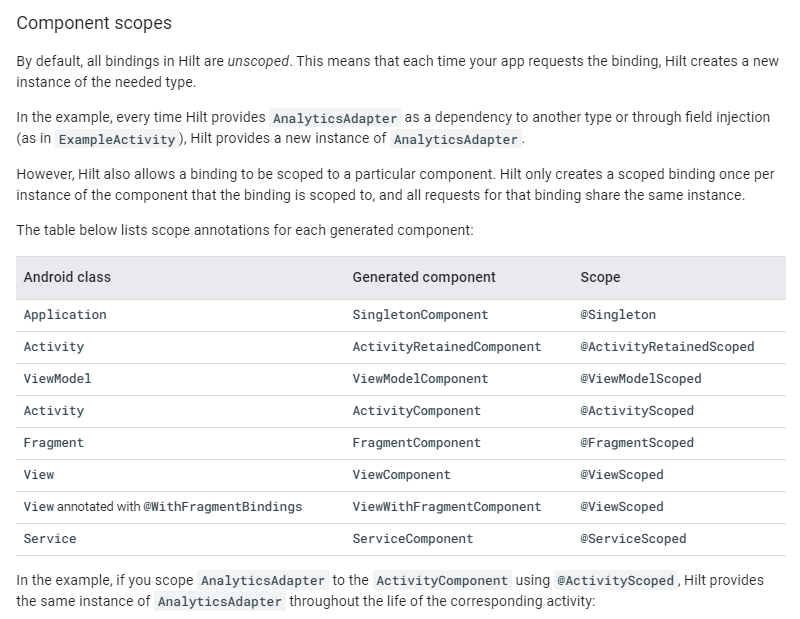 이러한 Hilt Component 세트는 밑 사진의 링크에서 볼 수 있다. 참고로 현재시간 기준 이 컴포넌트는 업데이트 후에 생긴거라 아직 한글 문서에는 나와있지 않다. SingletonComponent 외 다양한 컴포넌트가 있고 세세한 생명주기도 설정할 수 있다. 문서에 들어가서 쭉 한번 읽어봐야한다.