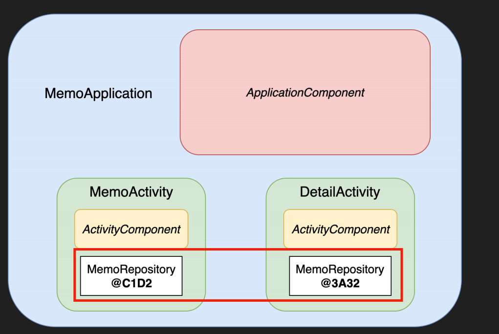 Application 에서 주입되고 앱이 시작부터 죽을때까지 말 그대로 Singleton 으로 처음 생성된 같은 객체가 주입될 것이다.