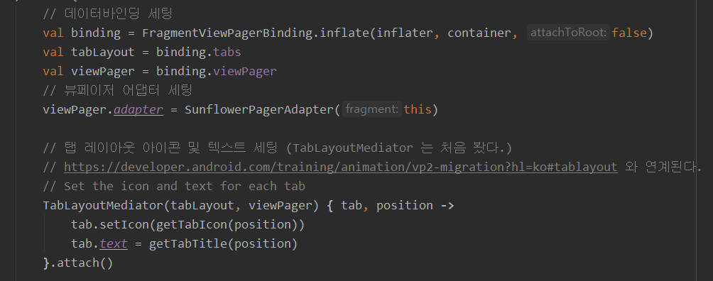 // 탭 레이아웃 아이콘 및 텍스트 세팅 (TabLayoutMediator 는 처음 봤다.)
