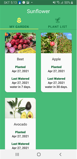 마지막으로 내가 위에서 살펴본 식물 상세화면에서 추가한 식물들을 보여준 GardenFragment 프래그먼트이다.