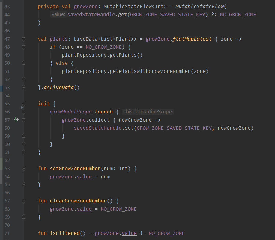 val plants: LiveData<List<Plant>> = growZone.flatMapLatest { zone ->
