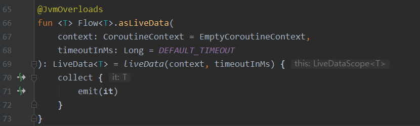 Repository로부터 데이터를 불러오고 Flow의 확장함수인 asLiveData()를 사용하여 Flow -> LiveData로 변환시켜준다.