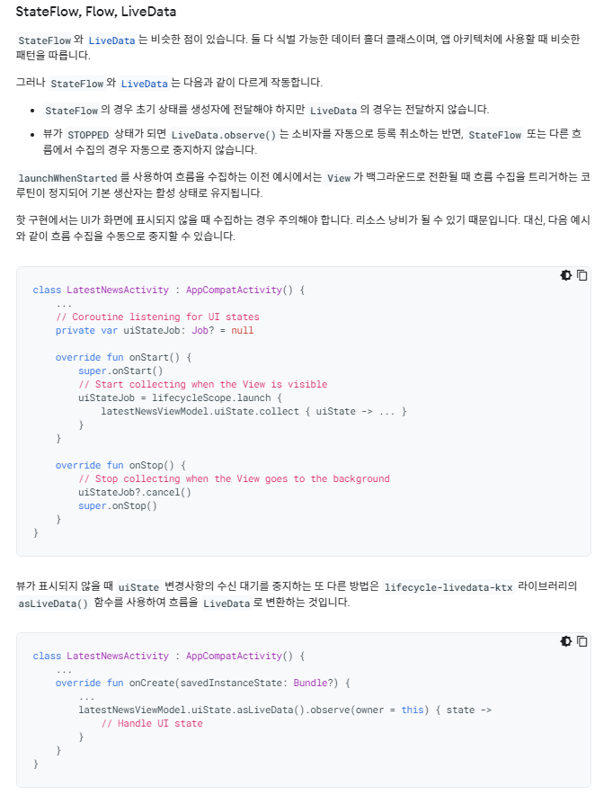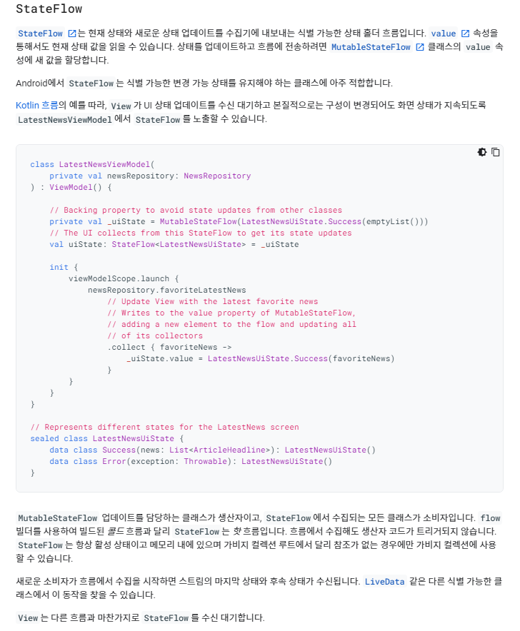 StateFlow, Flow, LiveData에 대한 차이점도 적혀있고 Flow 에 대한 개념설명이 잘 되어 있다. 안드로이드 공식문서(developer.android.com/kotlin/flow/stateflow-and-sharedflow)와 여러 블로그에(yoon-dailylife.tistory.com/72) Flow 기본에 대해 다음과 같이 설명이 잘 되어 있어 따로 설명은 생략하겠다.