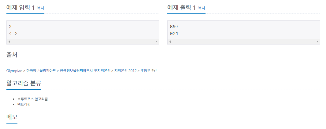 여러분은 제시된 부등호 관계를 만족하는 k+1 자리의 최대, 최소 정수를 첫째 줄과 둘째 줄에 각각 출력해야 한다. 단 아래 예(1)과 같이 첫 자리가 0인 경우도 정수에 포함되어야 한다. 모든 입력
