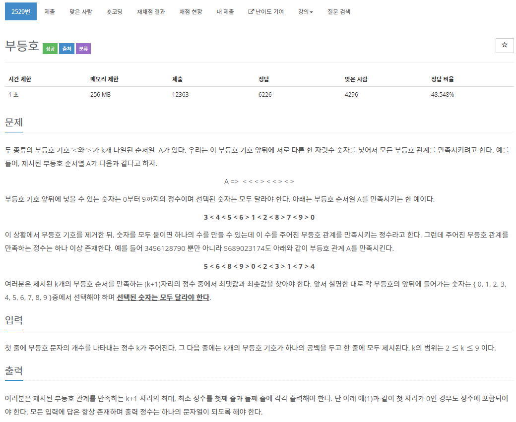 백준 백트래킹 유형의 2529번 부등호 문제를 풀어봤습니다.