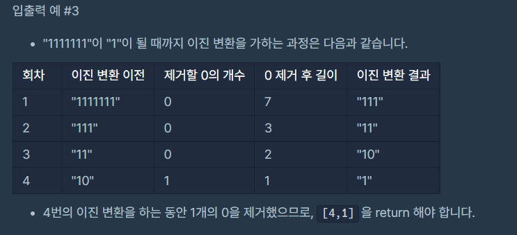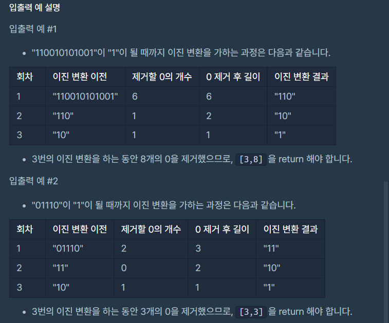 [알고리즘] 프로그래머스 이진 변환 반복하기 -문자열, 단순구현- 자바 본문