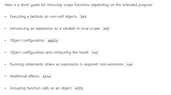 참고 : https://medium.com/@limgyumin/%EC%BD%94%ED%8B%80%EB%A6%B0-%EC%9D%98-apply-with-let-also-run-%EC%9D%80-%EC%96%B8%EC%A0%9C-%EC%82%AC%EC%9A%A9%ED%95%98%EB%8A%94%EA%B0%80-4a517292df29