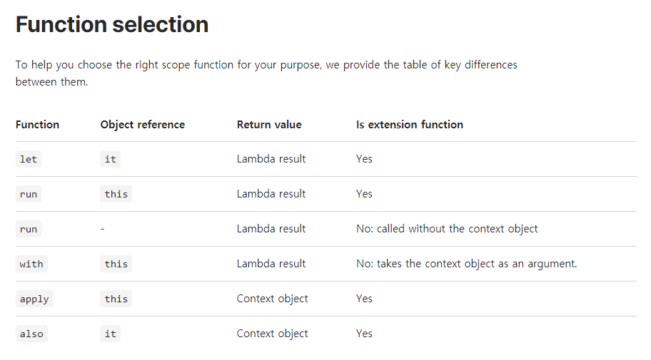 이러한 기능을 가진 함수를 범위지정함수(Scoping Functions)라고 하며 let, run, with, apply, also 총 다섯가지가 있습니다.