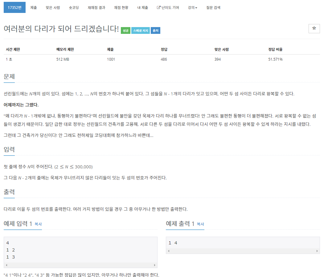 백준 17352 유니온파인드 유형의 문제를 풀어봤습니다. ㅎㅎ