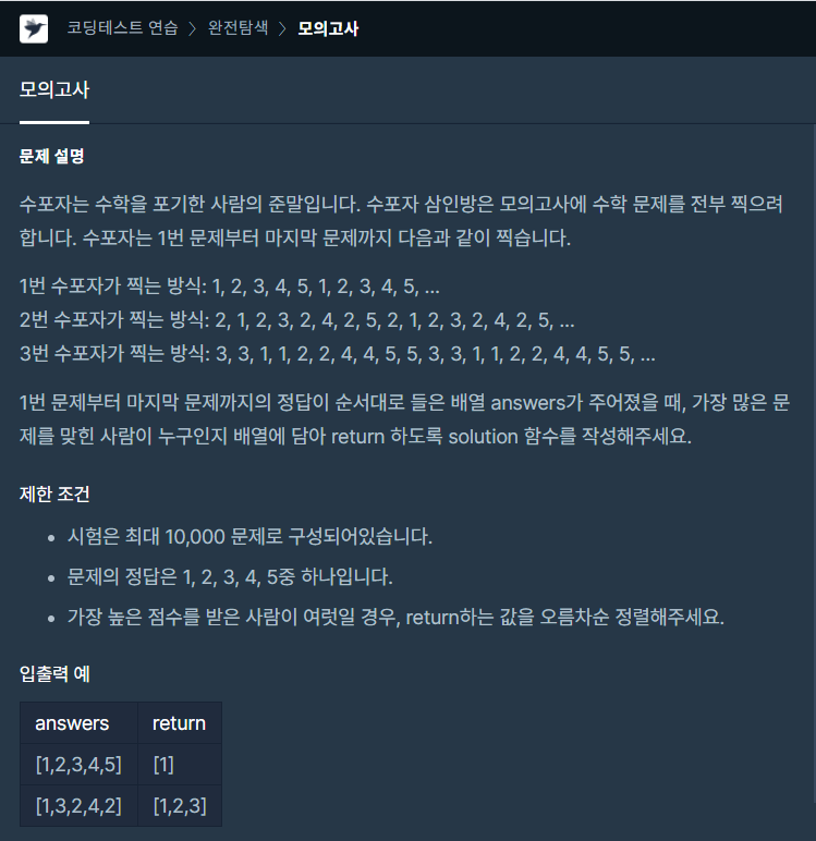 프로그래머스 모의고사 문제를 풀어봤습니다.