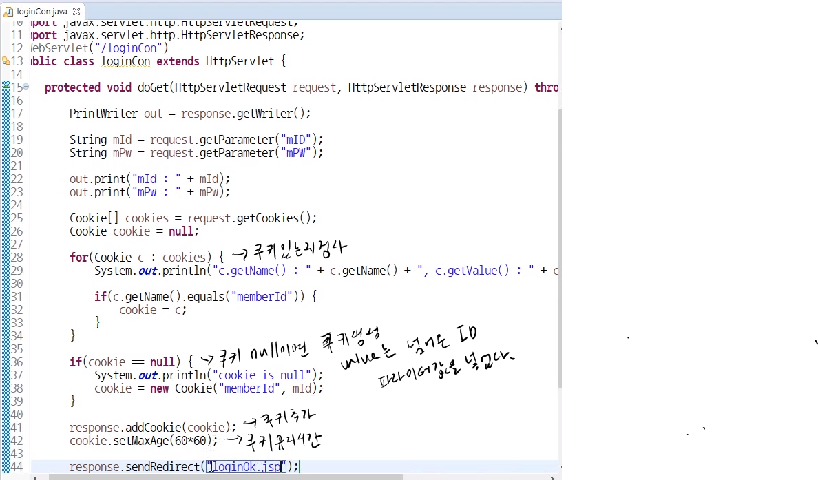 => 예를들어 로그인을 하면 쿠키 생성하고, 로그인이 되어있는 상태면 로그인을 하라고 페이지가 뜨면 안될것이다. ( 쿠키로 로그인이 된 상태인지 판단하여)